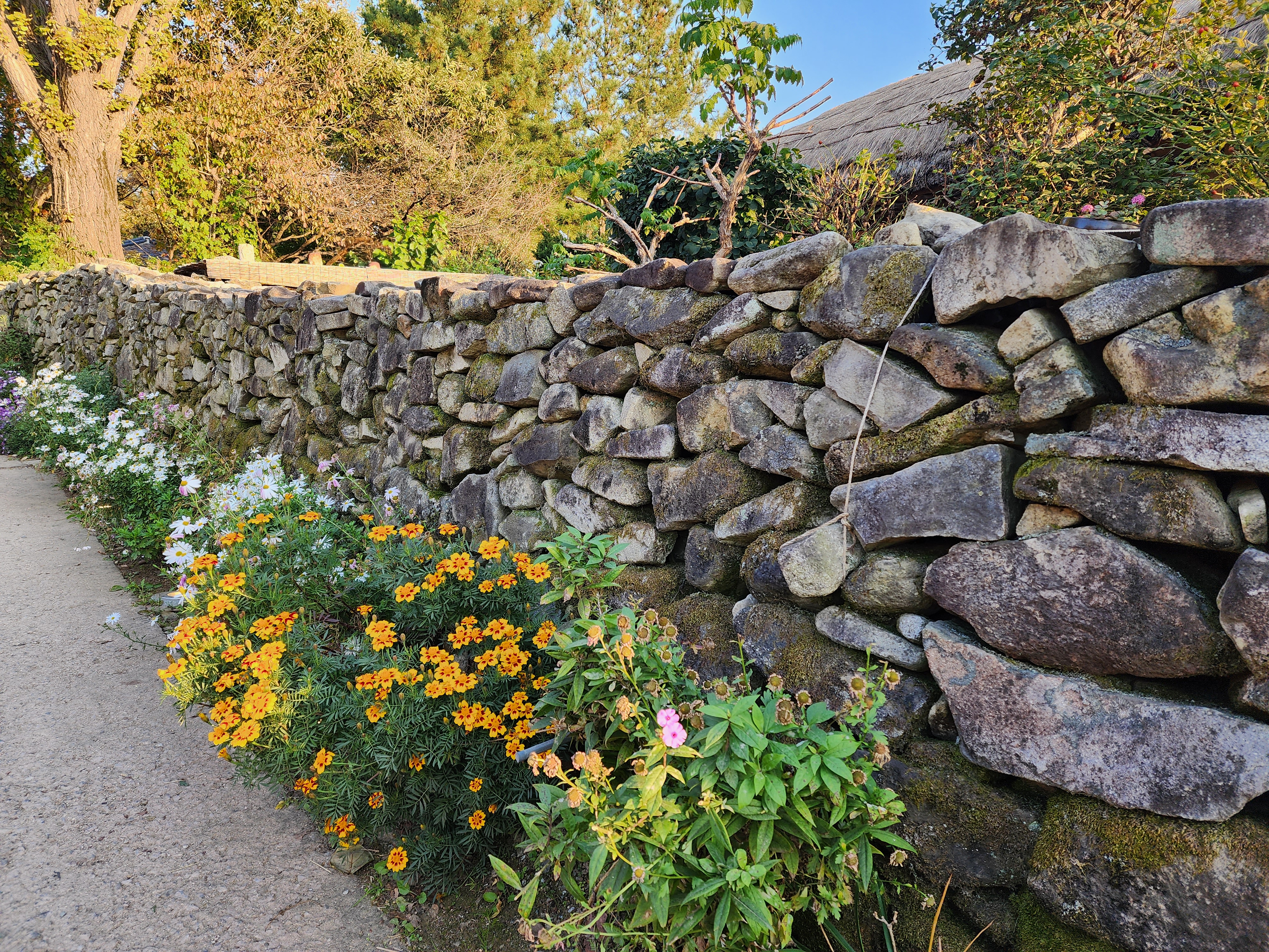 돌로 쌓은 담장과 넝쿨에 핀 꽃들까지도 예뻤어요.