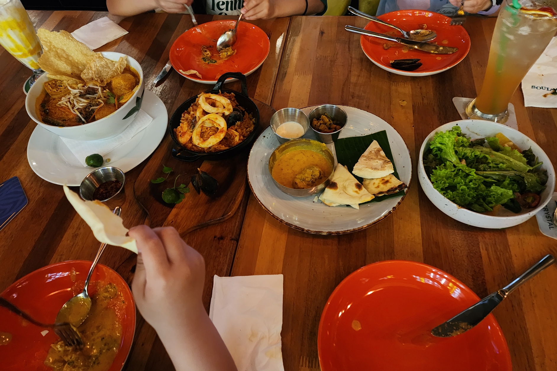 훈제오리 샐러드, 치킨커리와 난, 치즈피자, 해산물빠에야, 락사까지 먹고 싶은 음식 그냥 다 시켰어요.🤩🤩🤩